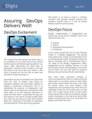 The document discusses the evolving role of quality analysts in the DevOps environment, emphasizing the importance of automation, agile methodologies, and continuous improvement to enhance project delivery and client satisfaction. It outlines the need for a focused approach in quality assurance, involving risk and improvement circles to ensure successful contract renewals and delivery stability. Additionally, the document highlights the potential of artificial intelligence in predicting client satisfaction through data analysis and decision tree models.