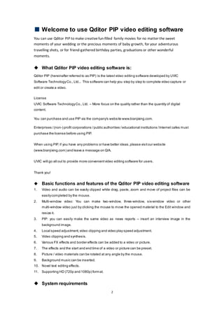 The document is a user guide for Qditor PIP, a video editing software developed by UVic Software Technology Co., Ltd., which allows users to create and edit videos with various features including multi-window video, speed adjustment, and audio editing. It provides detailed instructions on installation, system requirements, basic functions, and tips for effectively using the software. Users are also informed about licensing, support, and the formats supported by the software.