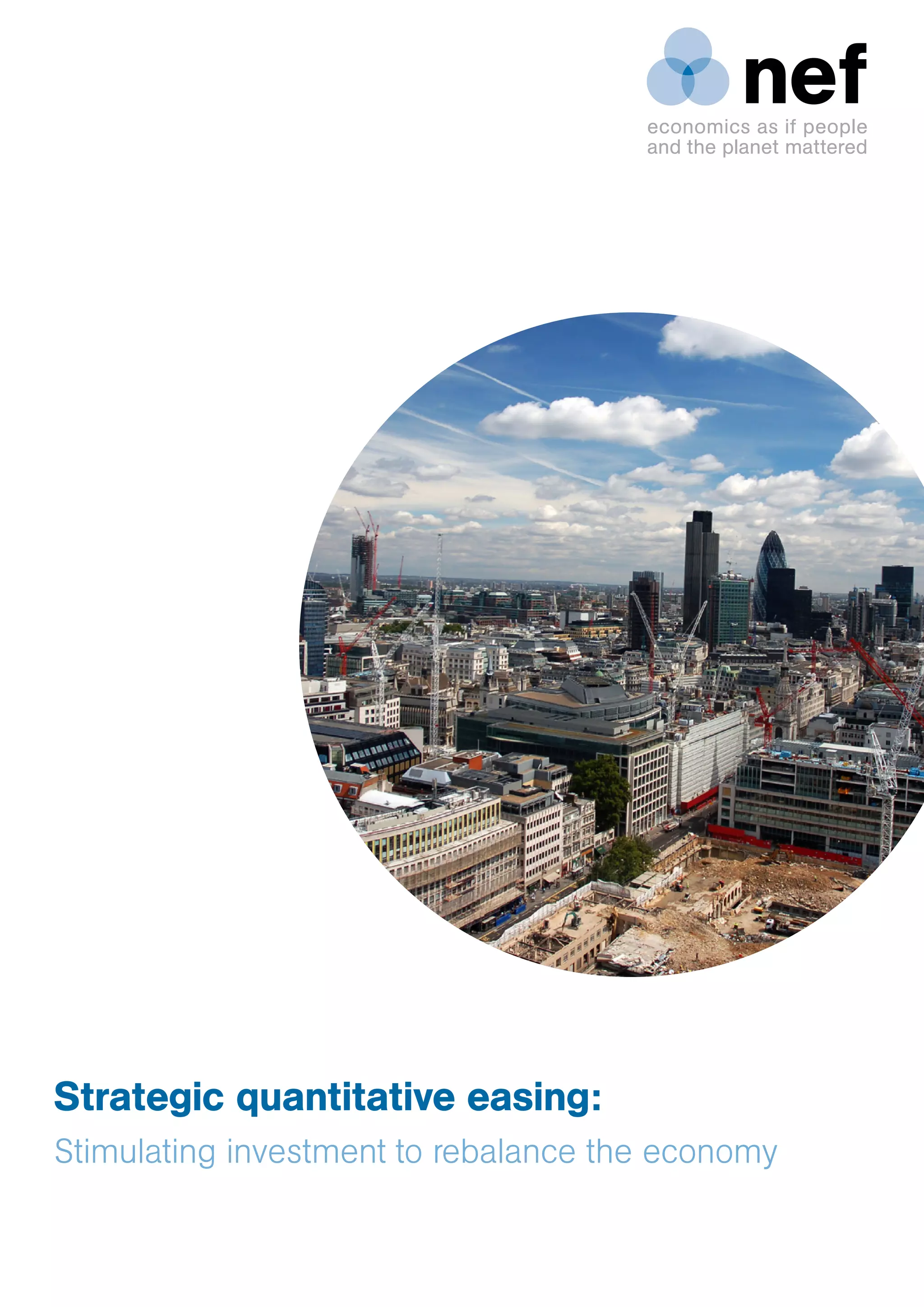 The document discusses strategic quantitative easing (QE) as a method to stimulate investment and rebalance the UK economy, critiquing existing policies for their ineffectiveness in driving growth. It suggests that QE should be focused on direct funding for productive investments, such as housing and infrastructure, rather than merely lowering interest rates without real economic impact. The report also proposes governance reforms to better align monetary policy with economic needs, emphasizing the necessity of a more targeted approach to QE.