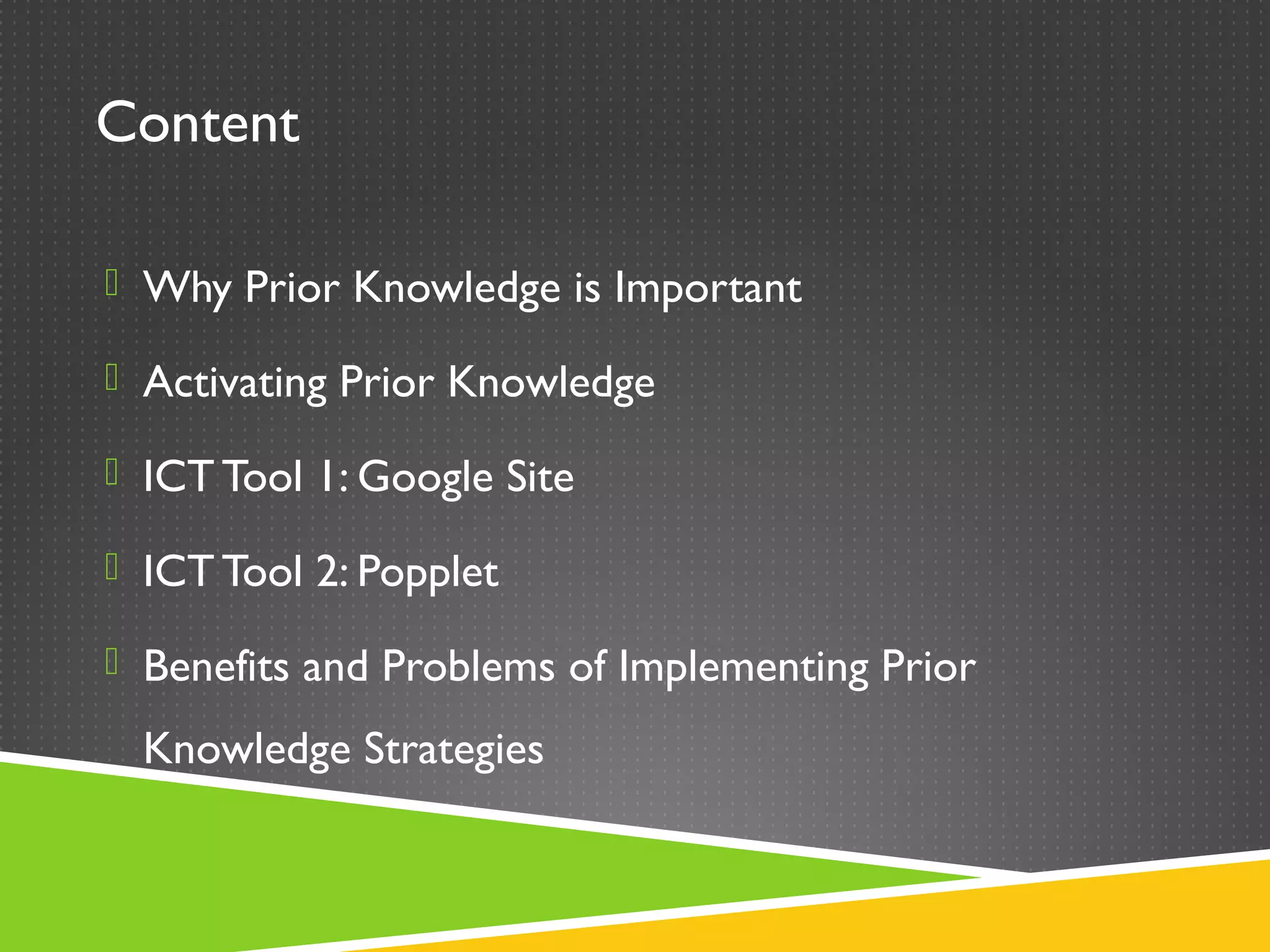 This document discusses engaging prior knowledge through the use of ICT tools. It defines prior knowledge as pre-existing beliefs, experiences, and understanding that learners bring with them. Activating prior knowledge is important as it helps learners connect new content to what they already know. The document describes tools like Google Sites and Popplet that can be used to activate prior knowledge through activities like brainstorming, semantic maps, and discussion. While ICT tools can increase engagement, their use also faces challenges like technical issues, time required for setup, and eliciting incorrect prior knowledge.