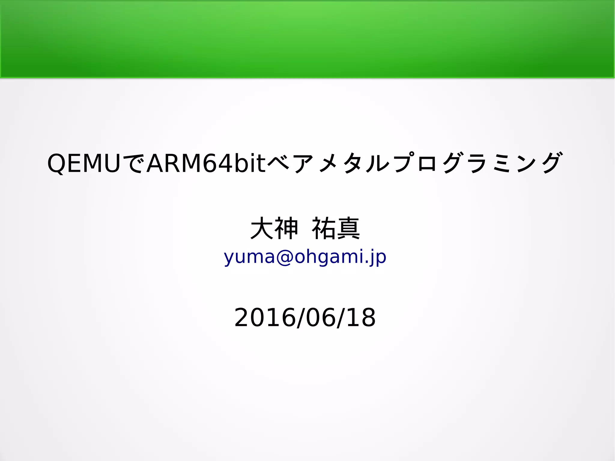 QEMUでARM64bitベアメタルプログラミング 大神 祐真 yuma@ohgami.jp 2016/06/18