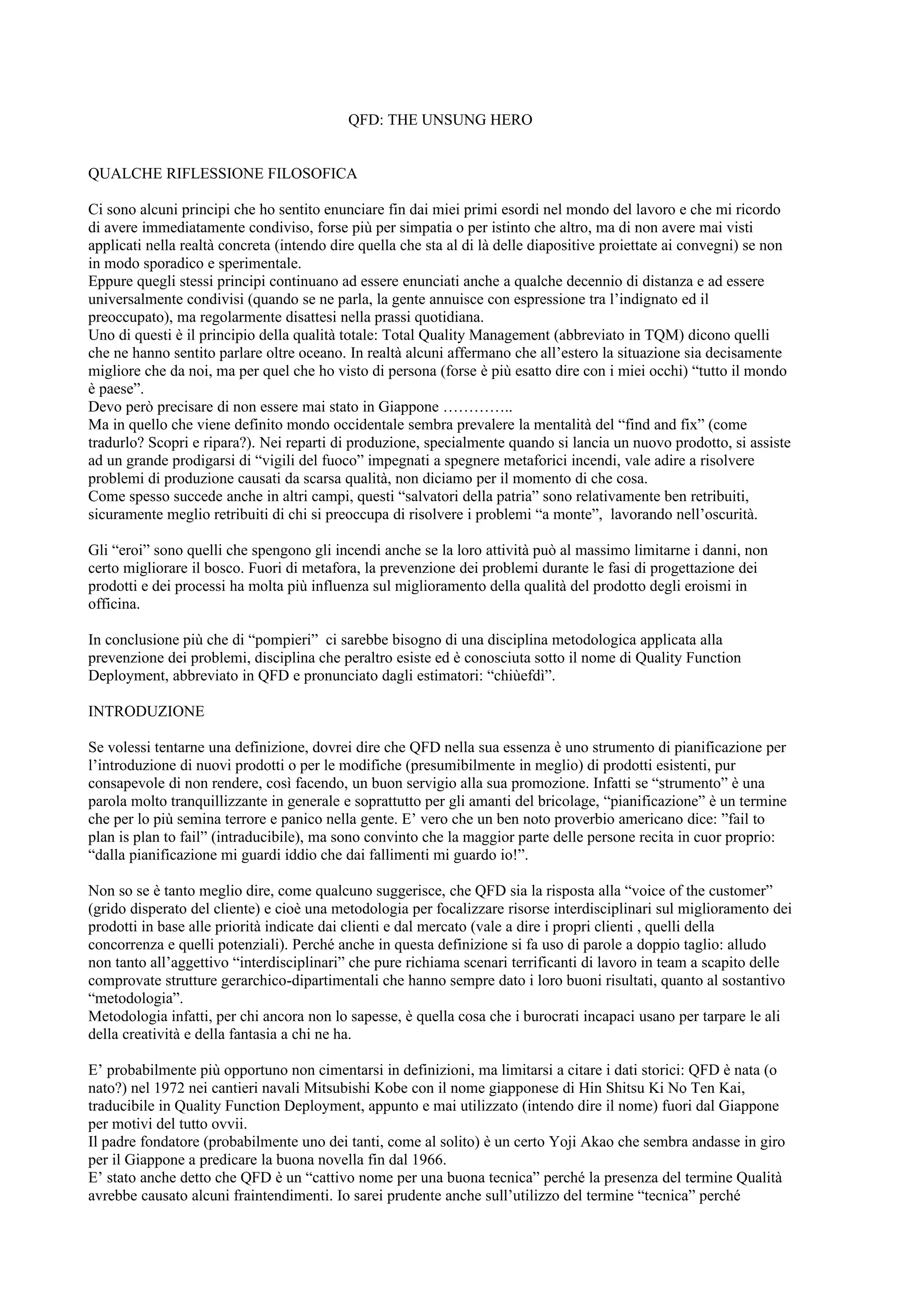 Il documento esplora il concetto di Quality Function Deployment (QFD) come metodologia per migliorare la progettazione e la produzione di prodotti, sottolineando l'importanza della prevenzione dei problemi piuttosto che della reazione ai guasti. Viene evidenziata l'insufficiente attuazione di principi di qualità totale nelle pratiche aziendali, nonostante l'ampia accettazione teorica. Il QFD è descritto come uno strumento che facilita la comunicazione delle esigenze del cliente e promuove l'impegno interfunzionale, contribuendo a un miglioramento sostenibile della qualità del prodotto.