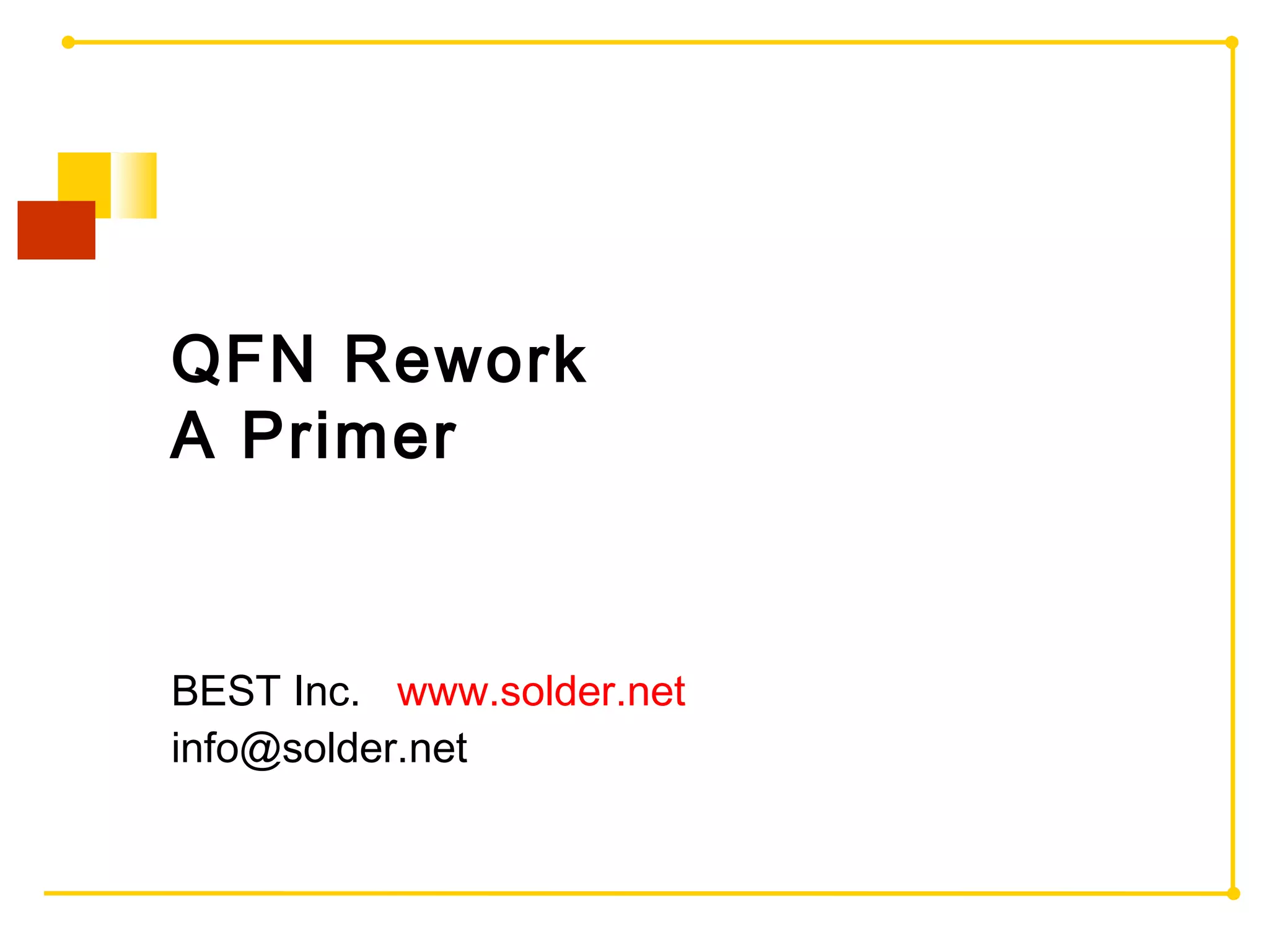 The document outlines a detailed process for reworking QFN (Quad Flat No-lead) packages according to IPC 7711 standards. It includes steps such as aligning and applying the stencil, rolling solder paste, reflowing, and inspection of the device. The process emphasizes the use of polyimide peel-n-stick stencils for part bumping and solder applications.