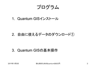 • Quantum GISを終了する 表示状態を破棄する 表示状態を名前をつけて保存する プロジェクトファイル 2011年11月5日 初心者のためのQuantumGIS入門 15