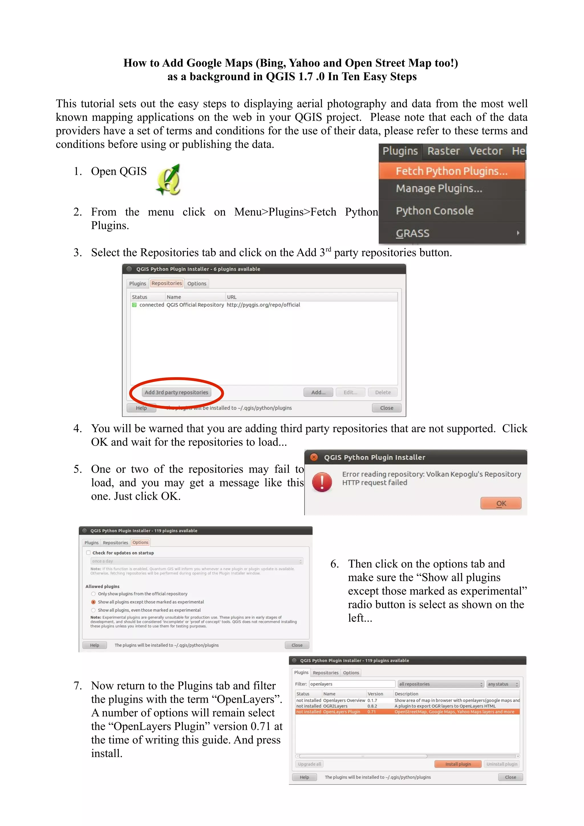 This tutorial outlines ten easy steps for adding Google Maps, Bing, Yahoo, and OpenStreetMap as background layers in QGIS 1.7.0, including installing the OpenLayers plugin and checking its functionality with a defined extent in a project. Users are advised to refer to the terms and conditions of each data provider before use or publication of their data.