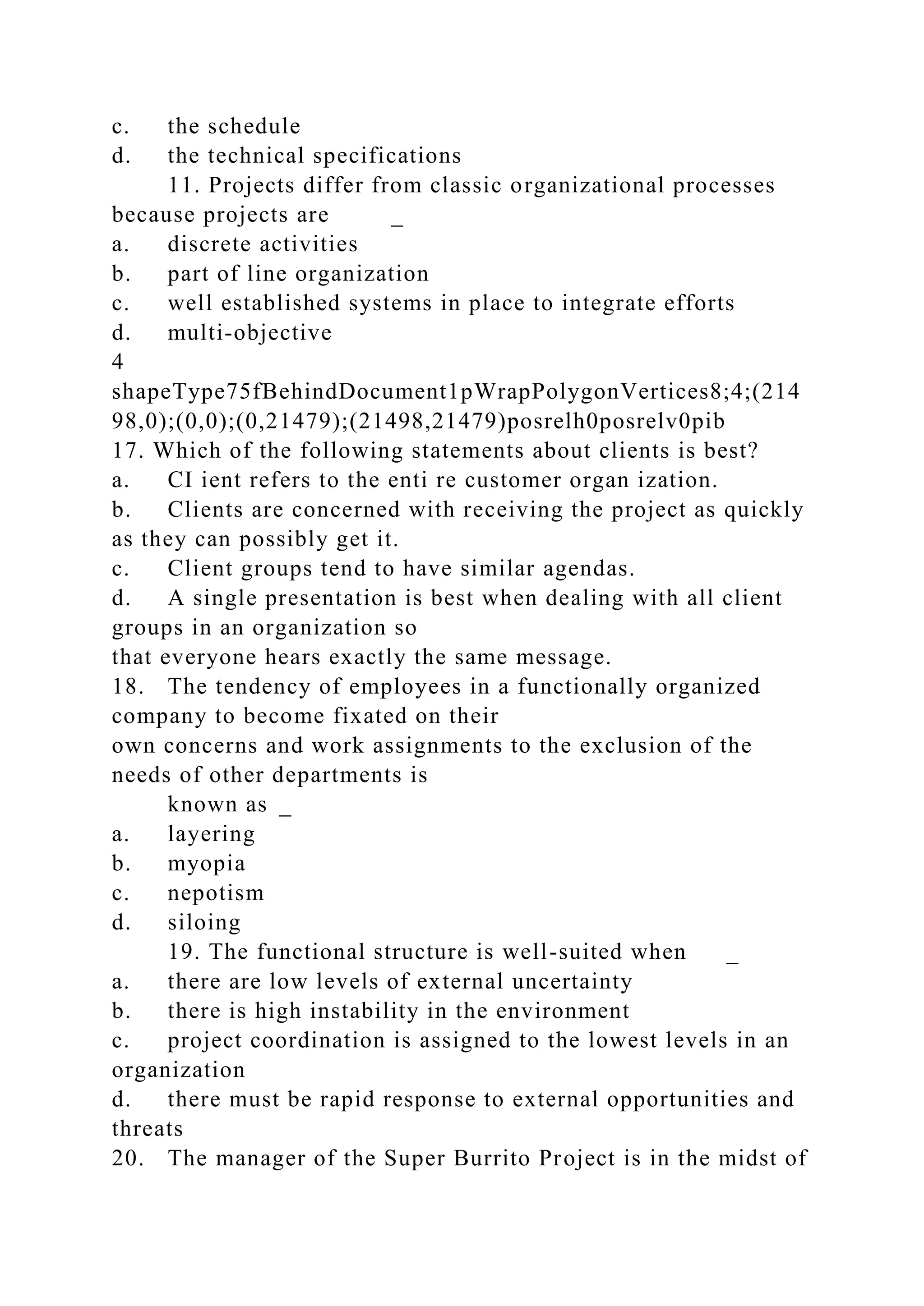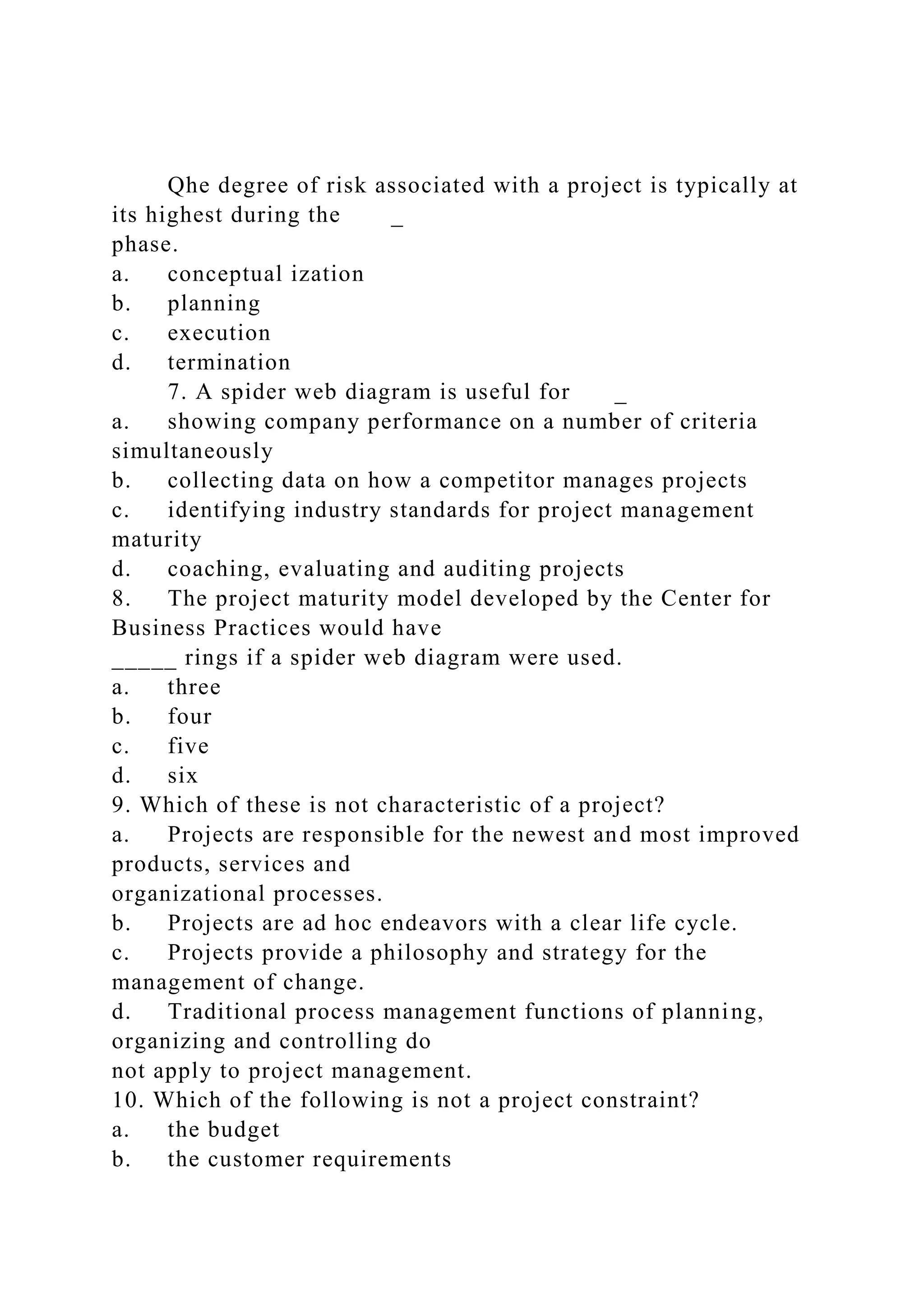 The document discusses various aspects of project management, including phases of risk, characteristics of projects, organizational structures, budgeting methods, and performance assessment. It highlights the significance of project portfolios, team dynamics in different stages of development, and the importance of effective communication and resource allocation. Additionally, it addresses budgeting techniques and the evaluation of project outcomes through final reports.
