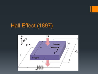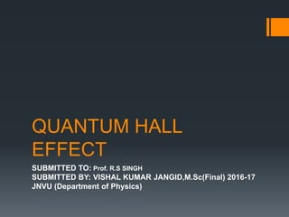 This document summarizes the quantum Hall effect. It describes the conditions needed to observe the effect including low temperatures, strong magnetic fields, and using a MOSFET. The quantum Hall effect results in the Hall resistivity being quantized as integers or fractions of h/e^2 depending on if it is the integer or fractional quantum Hall effect. The integer effect can be explained by considering non-interacting electrons forming discrete Landau levels. The fractional effect involves strongly interacting electrons condensing into an incompressible liquid state where quasiparticles have fractional charge.
