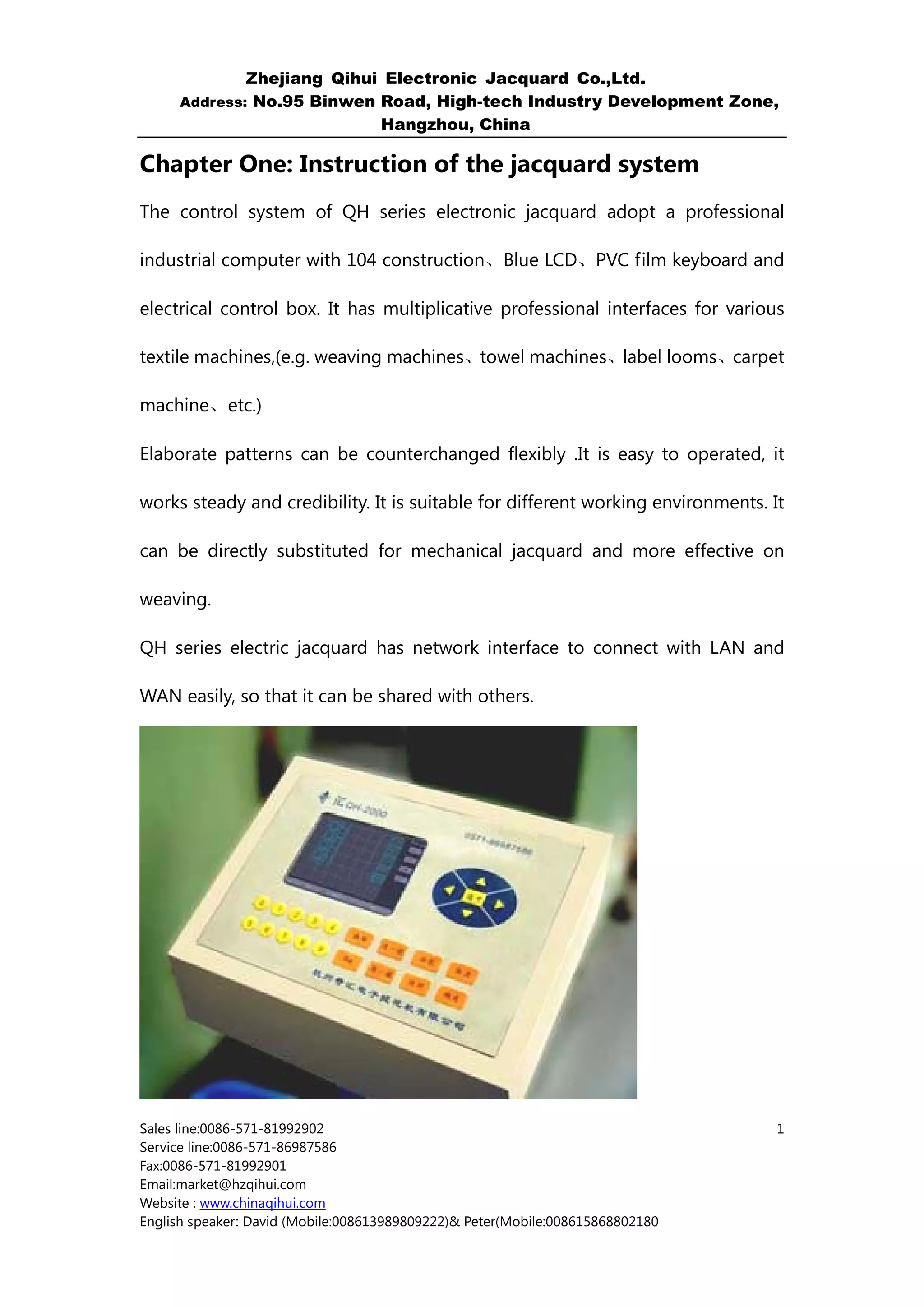 The document provides information about Zhejiang Qihui Electronic Jacquard Co., Ltd., including their contact information, product details, and specifications. It describes their QH series electronic jacquard system, which uses an industrial computer control system and can be used with various textile machines. It also lists the technical specifications, environmental working conditions, and components of the jacquard system.