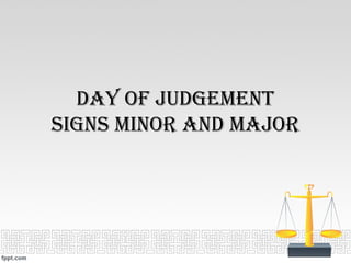 The document discusses signs of the Day of Judgment according to Islamic texts. It describes both minor and major signs. Minor signs include increased earthquakes and immorality. Major signs are more dramatic, like the appearance of the Mahdi, Jesus, and Dajjal (Antichrist). The Mahdi will establish justice and a brief golden era. A war with Christians will end with Muslim victory and conquest of Constantinople. The Dajjal will deceive many before Jesus defeats him, establishing the final era before Judgment Day.