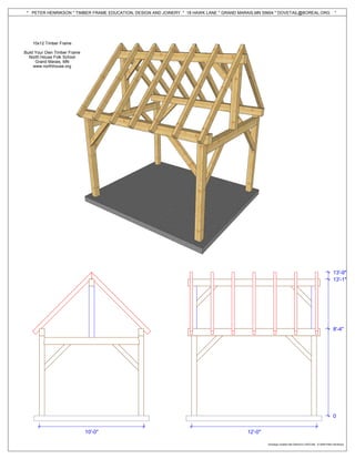 The document contains drawings and dimensions for three timber frame structures: a 10x12 frame, a 10x16 frame, and a 13.5x13.5 sauna frame. The drawings were created by Peter Henrikson using Dietrich's CAD/CAM software and advertise timber frame workshops at the North House Folk School in Grand Marais, Minnesota.