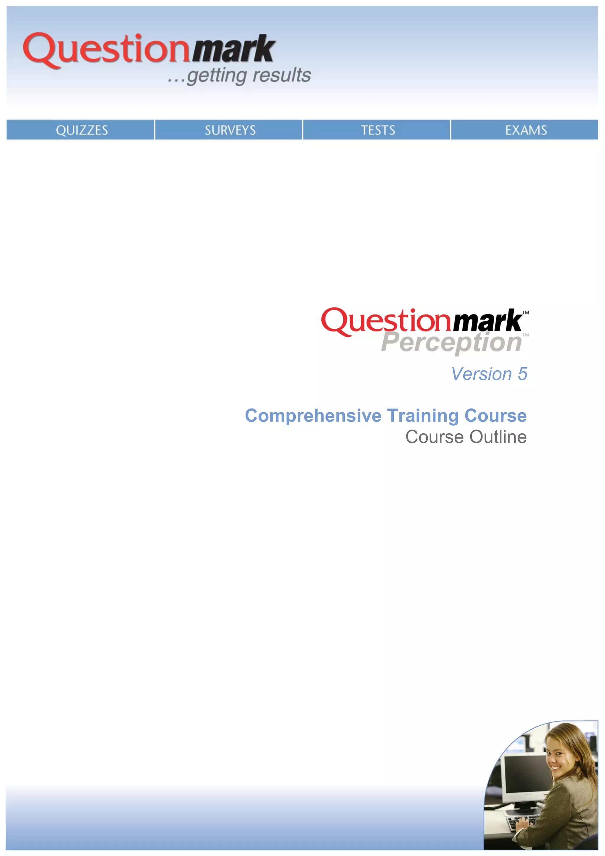 This document outlines a comprehensive three-day training course that covers all aspects of using the Questionmark Perception assessment system. The course will teach participants how to author assessments, create and schedule participants, deliver assessments, analyze results, and generate reports. Over the three days, trainees will learn how to use the Authoring Manager to create questions and assessments, the Enterprise Manager for administration and results, and the Reporter for generating reports. By the end of the course, participants will be able to independently use all the major components of Perception.