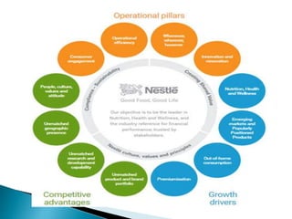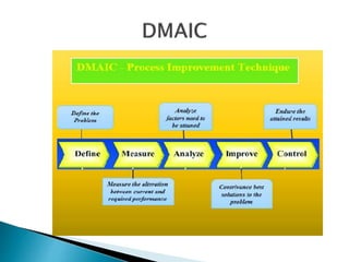 Nestle India Ltd is one of the biggest players in the FMCG segment in India operating in milk and nutrition, beverages, prepared dishes and chocolate and confectionery. The document discusses Nestle's operations strategy which focuses on nutrition, health and wellness to support people wanting a healthy lifestyle. It also discusses Six Sigma, a set of techniques used by Nestle to improve processes and reduce defects by identifying and removing causes of defects. The DMAIC approach of Define, Measure, Analyze, Improve and Control is used as part of Six Sigma to solve problems by reducing variation and defects.