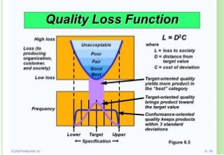 The document provides an overview of Taguchi Loss Function and Taguchi methodology. It discusses that Taguchi Loss Function is a graphical depiction developed by Genichi Taguchi to measure quality loss as the deviation from a target value. Loss is defined as a parabolic function of the deviation. Taguchi proposed measuring quality from a customer perspective using Signal to Noise Ratio. The methodology aims to design robustness using orthogonal arrays and reduce variation and costs.