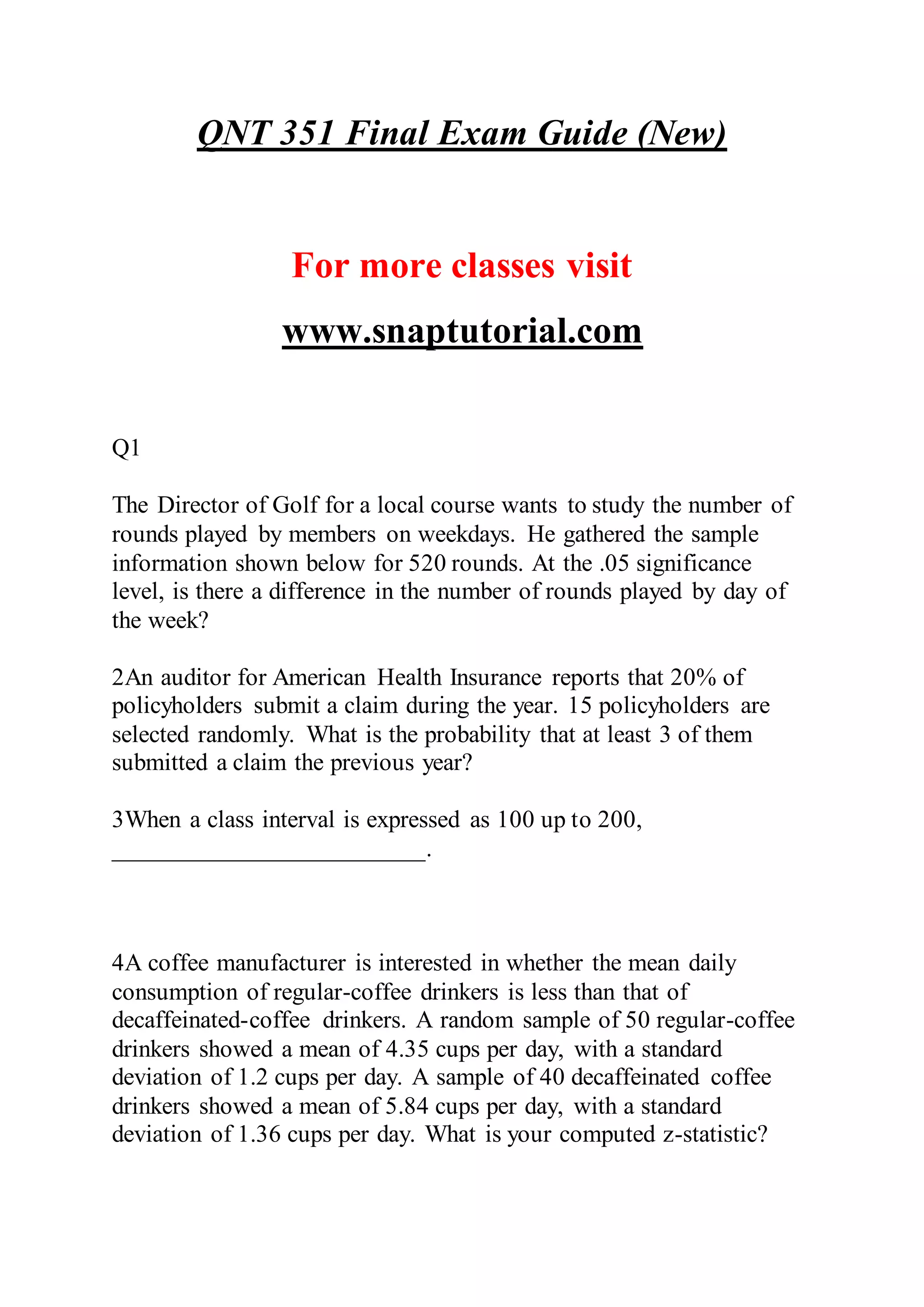 This document provides a guide for the QNT 351 final exam, including 30 multiple choice questions covering topics in descriptive statistics, levels of measurement, measures of central tendency, probability, and probability distributions. It also provides the correct answers to the 30 questions.