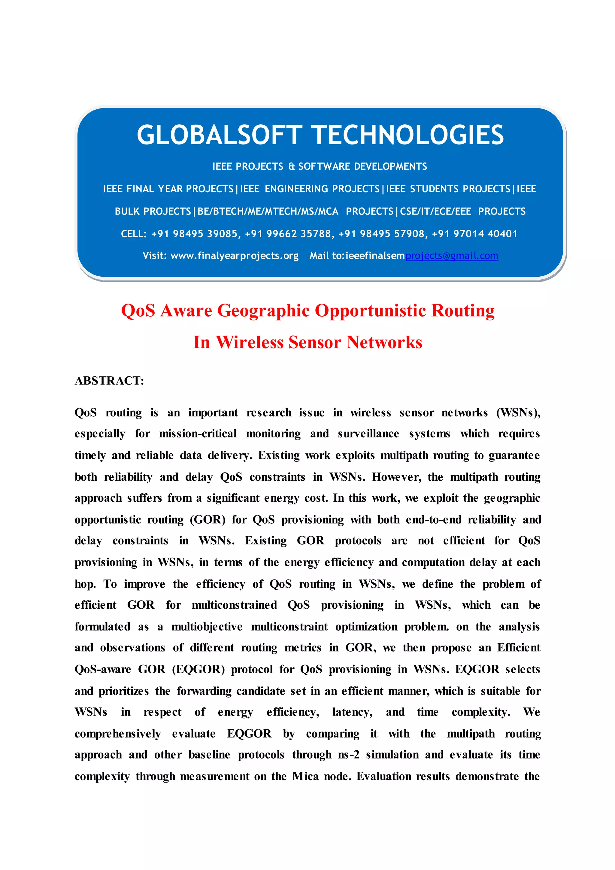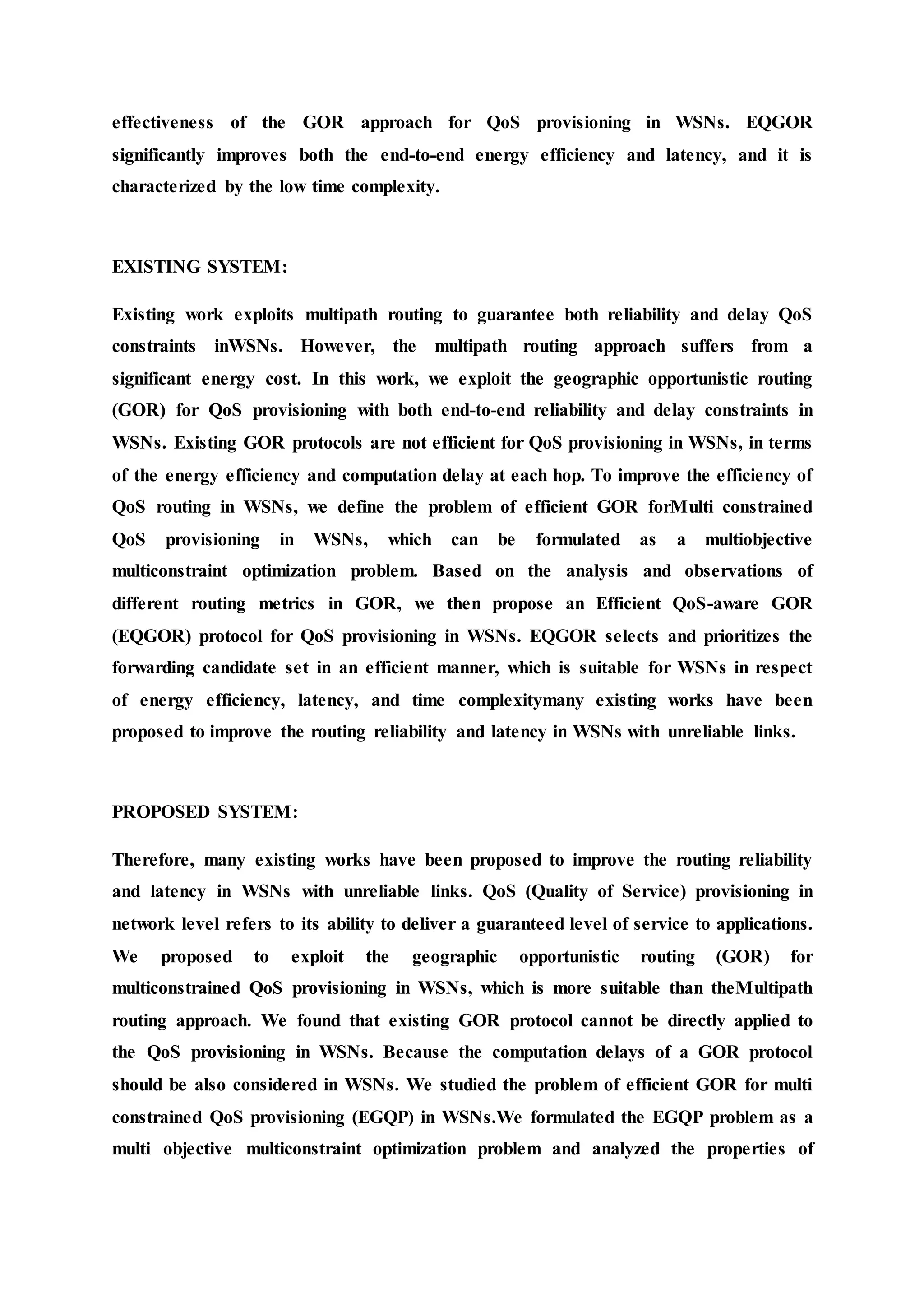 This document discusses the development of an efficient quality of service (QoS)-aware geographic opportunistic routing (EqGoR) protocol for wireless sensor networks (WSNs), aimed at addressing both end-to-end reliability and delay constraints while improving energy efficiency. The study formulates the problem of efficient geographic opportunistic routing (EGQP) as a multi-objective multi-constraint optimization problem and demonstrates through evaluations that EqGoR outperforms existing multipath routing methods. The paper highlights the importance of considering computation delays and proposes a balanced approach tailored for resource-limited sensor devices.
