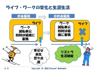 1. 第69回マイスターネット講演会 QOLを高めるリーダーシップとは 2. ライフ・ワークの変化と生涯生活 3. 終身雇用から、個人と社会の共生へ 4. キャリア(仕事人生)開発 個人と社会の共生 5. 他律から、自律・自己責任へ 個人と社会の共生 6. 自己変革の傾向:イノベーションの普及 7. リーダーシップの変遷 8. リーダーシップの源泉とは 9. インプット学習とアウトプット学習インプット学習 10. インプット学習、アウトプット学習、創造インプット学習 アウトプット学習