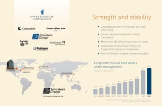 The document outlines the services offered by a Canadian financial institution, emphasizing its long history and vast reach across the country. It highlights the financial challenges faced by Canadians, such as low retirement readiness and the benefits of having a financial advisor. The institution aims to provide comprehensive financial planning and management tailored to individual needs, including investment, insurance, and tax planning services.