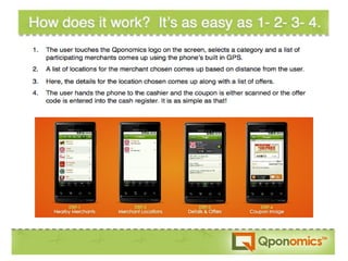 Qponomics is a free mobile coupon application that uses GPS technology to send electronic coupons to users in their geographic location in real time. It targets the growing number of smartphone users, estimated to reach 150 million by the end of 2009. Qponomics allows businesses to design targeted mobile coupon campaigns, track their performance, and go paperless - helping the environment.