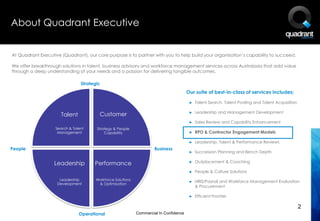 Quadrant Executive offers workforce solutions that enhance compliance, reduce contractor risks, and optimize talent management through a flexible engagement framework. Their services aim to lower costs, improve productivity, and ensure lawful contractor engagement by addressing legal obligations and providing a compliant on-boarding process. The document outlines potential savings and emphasizes the value of a structured approach to contractor management, highlighting the need for a business case and implementation plan.
