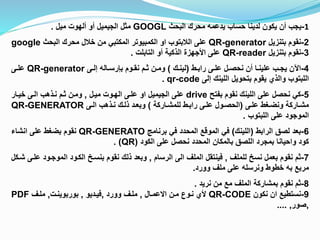 يتناول الوثيقة كيفية استخدام تقنيات إنشاء وقراءة أكواد QR عبر الهواتف الذكية والأجهزة اللوحية، مع خطوات واضحة تتضمن تنزيل التطبيقات المطلوبة. كما يشير البحث إلى إمكانية مشاركة الملفات بمختلف الأشكال مثل وورد وPDF، وكيفية نقل الملفات بين الأجهزة الذكية والكمبيوتر. يتضمن الدليل أيضًا طريقة تحليل وفحص الأكواد بواسطة التطبيقات المختلفة.