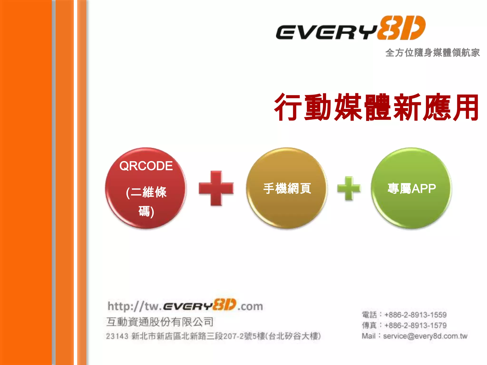 该文档介绍了多种行动媒体新应用,包括通过二维码进行的移动网页和应用推广,以增加用户参与和营销效果。它展示了在出版业和国际展览中利用二维码和移动应用的实际案例,鼓励用户加入手机会员和分享推荐。文末提供了咨询热线和官方网站信息以获取更多支持。