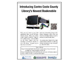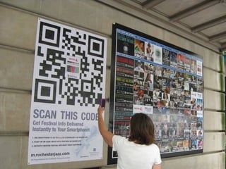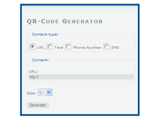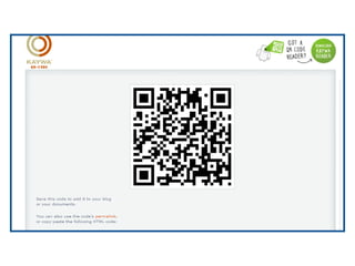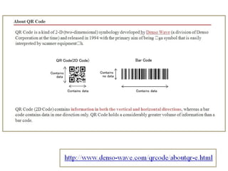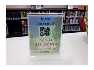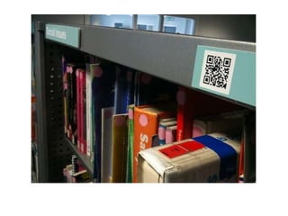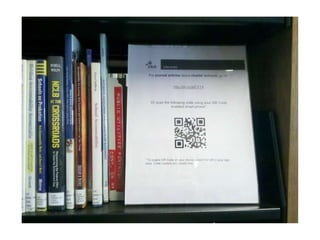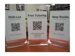 The document discusses how libraries can leverage QR codes to enhance services. It defines what QR codes are, how they can link to websites, phone numbers or text. It outlines how libraries can create and track QR codes to provide information on campus or in special collections. The document suggests QR codes could be used for directions, equipment instructions or digital library tours. It predicts mobile devices will become more prominent in education and QR codes can expand learning beyond campus.