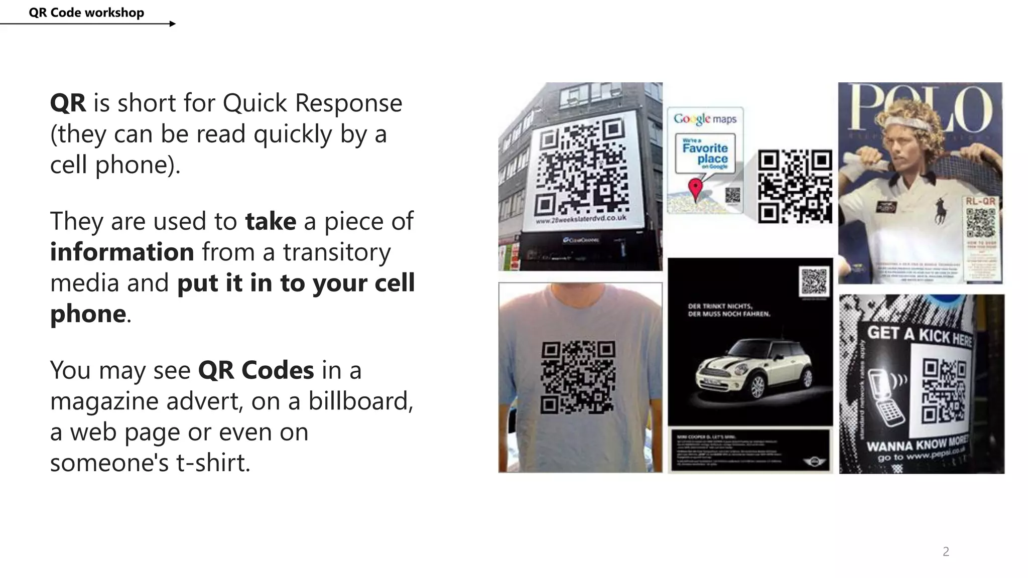 The document outlines a workshop on creating and using QR codes, emphasizing their role in educational projects to share information about trees. It details various tasks including researching tree information, creating documents, and generating QR codes for sharing. The workshop also covers the technology behind QR codes and provides step-by-step instructions for creating QR codes and accessing content through mobile devices.
