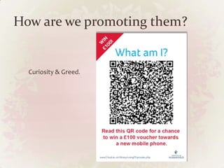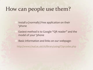 The document discusses the use of mobile phones in libraries, focusing on services like 'text a librarian' and QR codes. It highlights statistics on mobile phone usage and the practical applications of QR codes in providing access to resources and information. Additionally, it offers guidance on how patrons can engage with these services and promotes feedback through various communication channels.