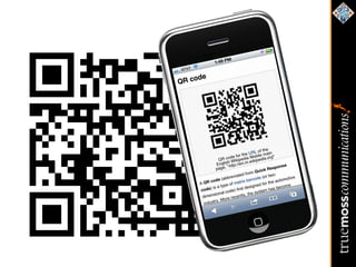 The document discusses QR codes, their functionality, and various applications in everyday life. It highlights the growth in QR code usage and creation, particularly among mobile phone users, and emphasizes the importance of creating mobile-optimized content for QR codes. Additionally, it offers tips on best practices, creatively leveraging QR codes, and providing user instructions for scanning.