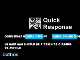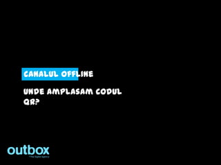 Documentul discută despre utilizarea codurilor QR pentru a conecta canalele offline cu cele online, evidențiind diverse locații și formate pentru plasarea acestora. Se prezintă statisticile de utilizare și motivele pentru care oamenii nu folosesc codurile QR, precum lipsa unui smartphone sau dificultăți în utilizarea aplicațiilor de scanare. De asemenea, documentul menționează tendințele în creșterea utilizării codurilor QR și alternativele tehnologice emergente.