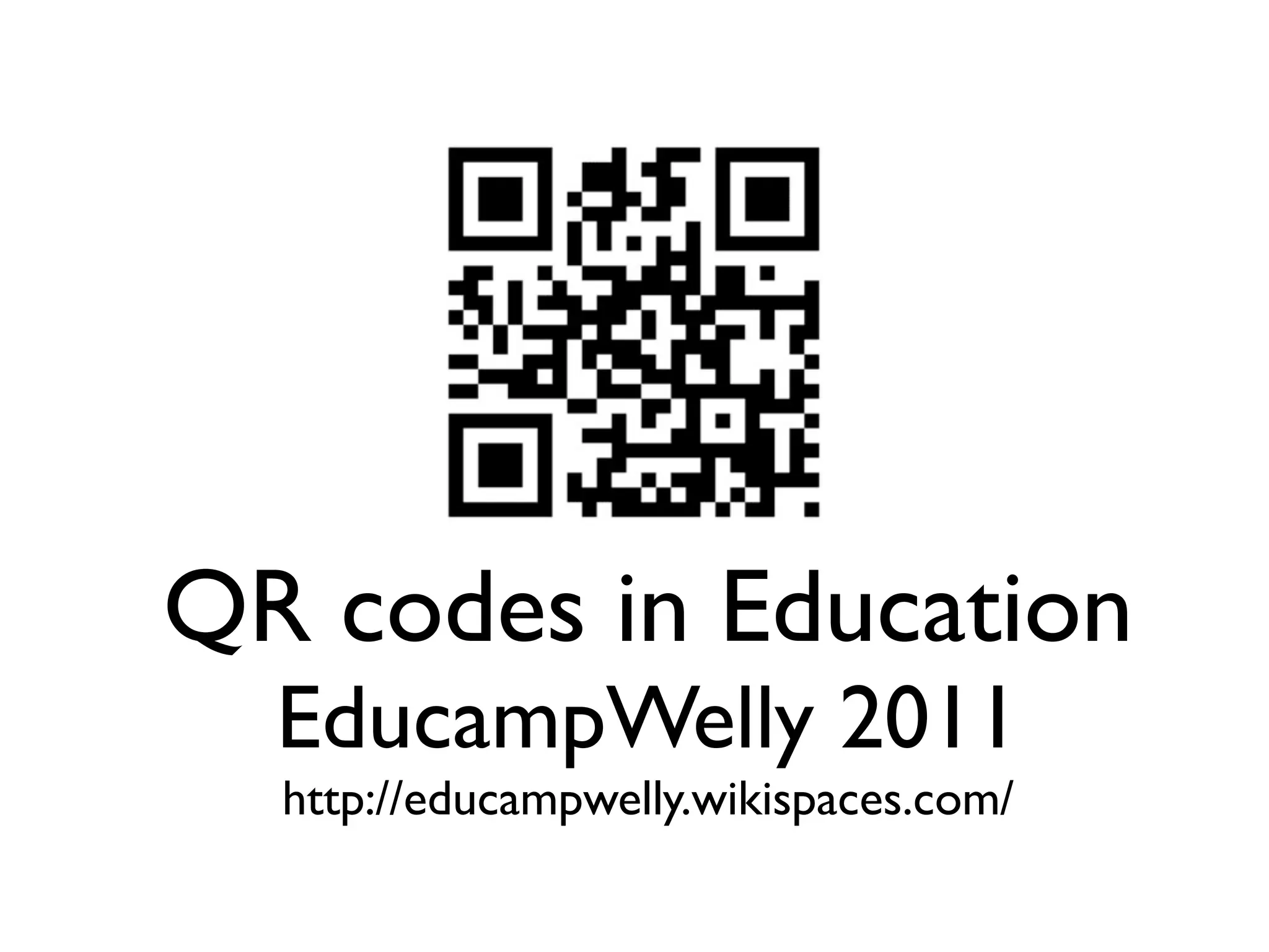 QR codes can be created for free online and contain information that links to websites, files, contact details when scanned by smartphones. They have various educational uses including providing additional context on field trips, embedding questions to encourage deeper learning, linking to reference materials, instructional videos, or music. QR codes could also be used for communication purposes like sharing calendar events, emergency contacts, or wifi login credentials. The document provides examples and resources for using QR codes in both classroom and outdoor learning environments.