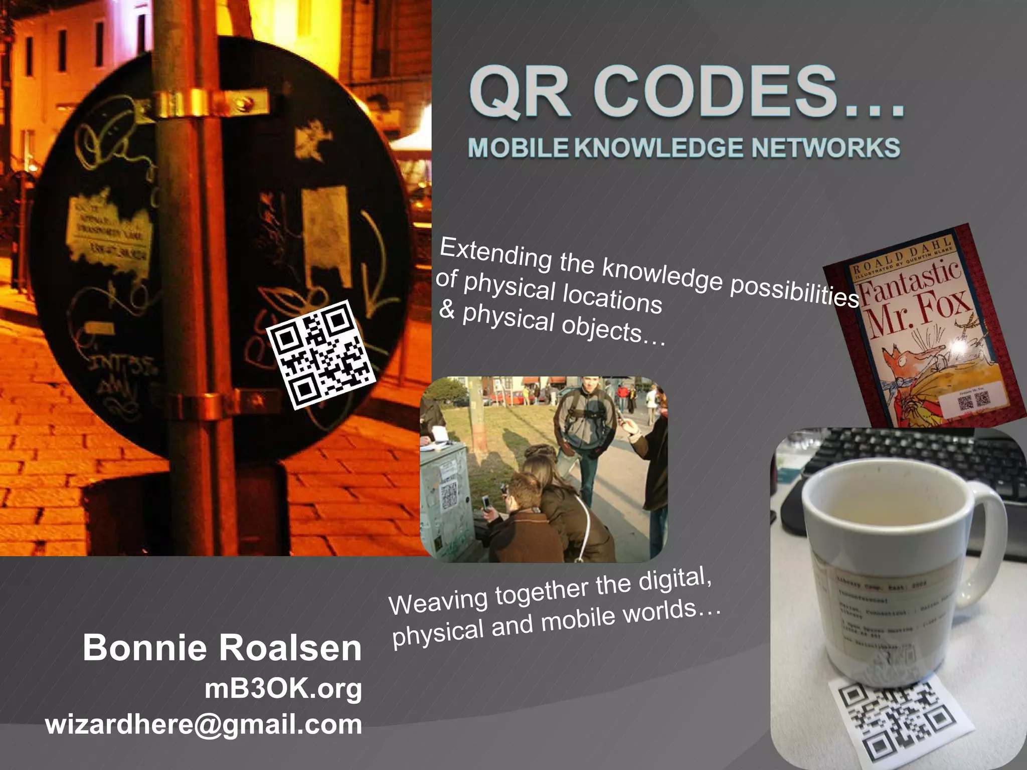 ![Bonnie Roalsen mB3OK.org [email_address] Extending the knowledge possibilities of physical locations & physical objects… Weaving together the digital, physical and mobile worlds…](https://image.slidesharecdn.com/qrcodesala-100624111943-phpapp02/75/QRcodes-Mobile-Knowledge-Networks-1-2048.jpg)