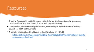 This document discusses quality assurance in modern software development. It begins by providing resources on the topic and outlining the agenda. It then reviews basic concepts of software, quality, and the differences between quality assurance and quality control. It introduces several quality models including McCall's quality model and discusses important factors in software quality. Finally, it covers quality assurance methodology using PDCA, quality management tools including Ishikawa diagrams and Pareto charts, and software quality testing. The document provides a comprehensive overview of key aspects of quality assurance in software development.