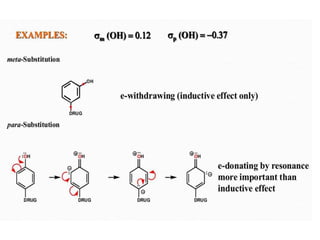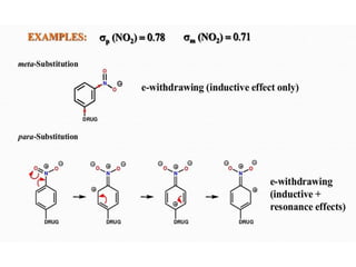 This document discusses QSAR (quantitative structure-activity relationship), which is a mathematical model that relates biological activity to physicochemical properties of molecules. QSAR can be used to predict activity of new compounds. Key parameters used in QSAR include hydrophobicity (measured by partition coefficient), electronic effects (Hammett constant), and steric effects (Taft's steric factor). These parameters influence drug absorption, distribution, and interactions with receptors. QSAR models take the form of biological activity = function(parameters) to develop relationships between activity and molecular properties.