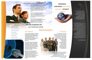 QServ offers business intelligence solutions including implementations of Hadoop, HBase, SAP BI, SAP Hana, BPC, and migration services. They provide retail analytics using big data technologies to process large amounts of data quickly and customize solutions to meet clients' specific needs. QServ has experience implementing SAP solutions and can help clients assess their BI needs and define a roadmap to achieve their goals.