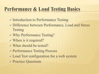 The document provides a comprehensive overview of HP LoadRunner, covering performance and load testing fundamentals, the differences between performance, load, and stress testing, and the importance of performance testing in software development. It explains key concepts like throughput, response time, and tuning, while outlining the performance testing process, objectives, and requirements. The document also details the technical specifications and operational guidelines for using LoadRunner effectively.
