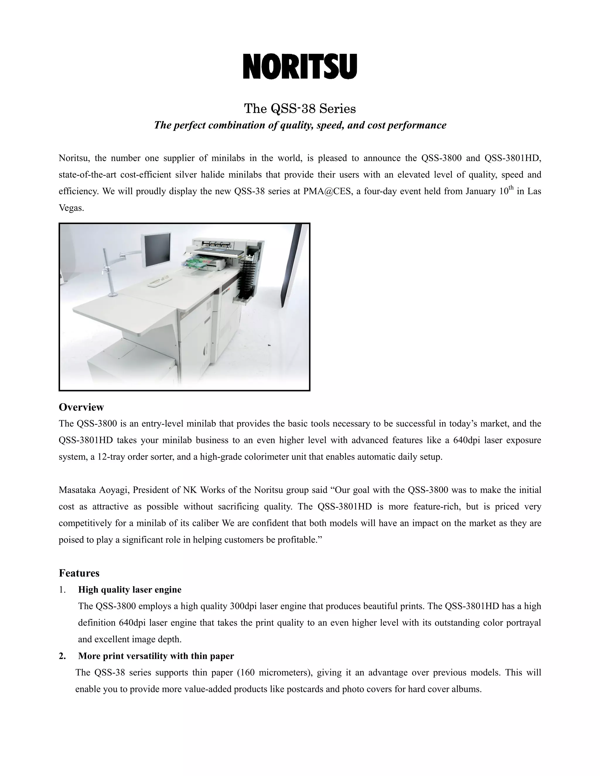 The document introduces the QSS-3800 and QSS-3801HD minilabs from Noritsu, the world's largest supplier of minilabs. The QSS-3800 is an entry-level model that provides basic tools for success at an attractive initial cost, while the QSS-3801HD has more advanced features but remains competitively priced. Both models offer high quality printing at high speeds along with new capabilities like support for thin paper and a compact design.