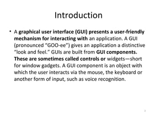 The document presents information on a GUI development presentation under Linux, including an introduction to graphical user interfaces and their components, examples of GUIs, characteristics of GUIs like windows and menus, advantages of GUIs like being easy to use, and a history of the Qt framework for cross-platform application development along with organizations that use Qt.