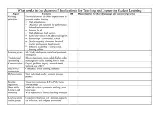 This document discusses improving learning through consistent practices across subjects at a school. It focuses on developing common frameworks for literacy learning, numeracy skills, technology use, study skills, differentiation, self-directed learning, assessment, and classroom conditions. Specific practices mentioned include using graphic organizers, explicit instruction models, inquiry learning, higher-order thinking, and differentiation strategies. The document advocates agreeing on shared concepts and language around these practices to promote student learning.