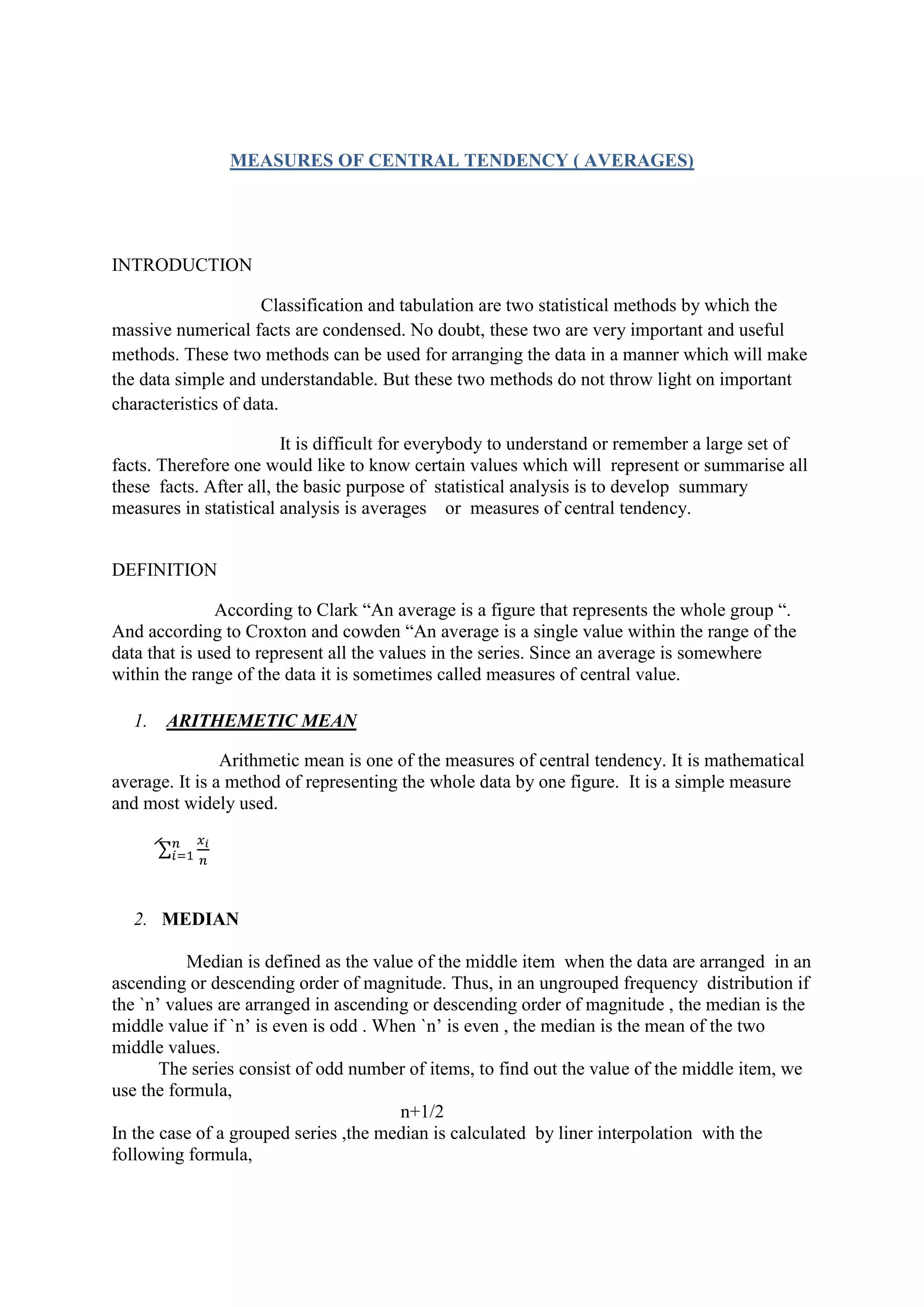 The document discusses various measures of central tendency (averages) and dispersion that are used to summarize and describe data in statistics. It defines common averages like the arithmetic mean, median, mode, harmonic mean, and geometric mean. It also covers measures of dispersion such as the range, quartile deviation, mean deviation, and standard deviation. As an example, it analyzes test score data from 5 students using the arithmetic mean to find the average score.