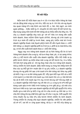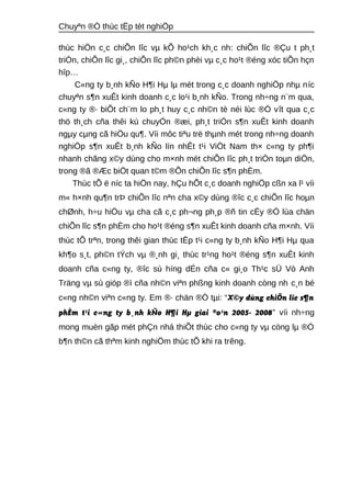 Tài liệu phân tích quá trình phát triển kinh tế của Việt Nam trong hơn 15 năm qua, nhấn mạnh sự chuyển đổi từ nền kinh tế kế hoạch hóa sang thị trường và những thành tựu nổi bật trong các lĩnh vực kinh tế, xã hội và an ninh quốc phòng. Điểm nhấn là sự cần thiết phải xây dựng chiến lược kinh doanh hiệu quả dựa trên sự biến đổi của môi trường kinh doanh, cũng như việc các doanh nghiệp cần năng động ứng phó với sự cạnh tranh trong thị trường toàn cầu. Tài liệu cũng nêu bật vai trò của một công ty kinh doanh trong ngành thực phẩm, đề cập đến lịch sử hình thành và phát triển của công ty này.