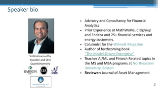 The document provides an overview of machine learning and artificial intelligence applications in finance, emphasizing its role in transforming investment strategies and risk management. It discusses key trends, case studies, and the importance of data science in enhancing financial analytics. Additionally, the speaker, Sri Krishnamurthy, highlights educational initiatives to train professionals in these technologies at QuantUniversity.