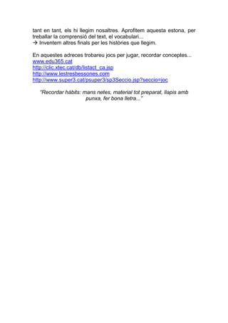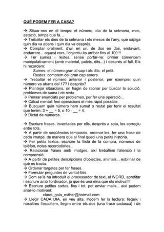 QUÈ PODEM FERA CASA?<br /> Situar-nos en el temps: el número, dia de la setmana, mes, estació, temps que fa…<br /> Treballar els dies de la setmana i els mesos de l’any, que sàpiga quin dia va abans i quin dia va després.<br /> Comptar oralment: d’un en un, de dos en dos, endavant, endarrere... aquest curs, l’objectiu és arribar fins al 100!!!<br /> Fer sumes i restes, sense portar-ne: primer comencem manipulativament (amb material, palets, dits...) i després al full. Els hi recordem: <br />Sumes: el número gran al cap i als dits, el petit.<br />Restes: comptem del gran cap enrere.<br /> Treballar el número anterior i posterior, per exemple: quin número va abans del 17? I després?<br /> Plantejar situacions, on hagin de raonar per buscar la solució, problemes de suma i de resta.<br /> Pensar enunciats per problemes, per fer una operació...<br /> Càlcul mental: fem operacions el més ràpid possible.<br /> Busquem quin número hem sumat o restat per tenir el resultat que tenim: 3 + __ = 5, o 10 - __ = 4.<br /> Dictat de números.<br /> Escriure frases, inventades per ells, després a sota, les corregiu entre tots.<br /> A partir de seqüències temporals, ordenar-les, fer una frase de cada imatge, de manera que al final quedi una petita història.<br /> Fer petits textos: escriure la llista de la compra, números de telèfon, notes recordatòries...<br /> Relacionar frases amb imatges, així treballem l’atenció i la comprensió.<br /> A partir de petites descripcions d’objectes, animals... esbrinar de què es tracta.<br /> Ordenar targetes per fer frases.<br /> Formular preguntes de veritat-fals.<br /> Com se’ls ha introduït el processador de text, el WORD, aprofitar i escriure amb l’ordinador, ja que és una eina que els motiva!!!<br /> Escriure petites cartes, fins i tot, pot enviar mails... així podem anar-lo motivant: <br />claret_gala_esther@hotmail.com<br /> Llegir CADA DIA, en veu alta. Podem fer la lectura: llegeix i nosaltres l’escoltem, llegim entre els dos (una frase cadascú) i de tant en tant, els hi llegim nosaltres. Aprofitem aquesta estona, per treballar la comprensió del text, el vocabulari...<br /> Inventem altres finals per les històries que llegim.<br />En aquestes adreces trobareu jocs per jugar, recordar conceptes...<br />www.edu365.cat<br />http://clic.xtec.cat/db/listact_ca.jsp<br />http://www.lestresbessones.com<br />http://www.super3.cat/psuper3/sp3Seccio.jsp?seccio=joc<br />“Recordar hàbits: mans netes, material tot preparat, llapis amb punxa, fer bona lletra...”<br />