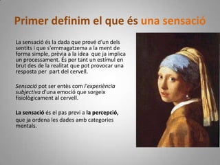 Primer definim elque és una sensació La sensació és la dada que prové d'un dels sentits i que s'emmagatzema a la ment de forma simple, prèvia a la idea que ja implica un processament. És per tant un estímul en brut des de la realitat que pot provocar una resposta per part del cervell. Sensació pot ser entès com l'experiència subjectiva d'una emoció que sorgeix fisiològicament al cervell.La sensació és el pas previ a la percepció, que ja ordena les dades amb categories mentals.