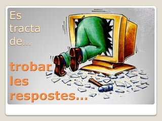 Quèésdoncs, una WebQuest?UnaWebQuest, com diu el seu nom, és una activitat d’estudi a base d’una pregunta. Els alumnes han de treballar en grups, dividint assignacions per a cada un d’ells. Així aconseguirem que cada nen/a tingui un paper determinat i tingui una responsabilitat davant la seva funció individual. L’objectiu de l’activitat és dotar al/les nens/es d’interés per la lectura, per l’anàlisi i per la síntesi d’informació a base de la WWW (WorldWide Web). Aquesta eina, la WWW, és una eina molt potent però alhora és perillosa si no dotem als/les nens/es de coneixements per saber utilitzar-la. Aquest és el major objectiu de la WebQuest.