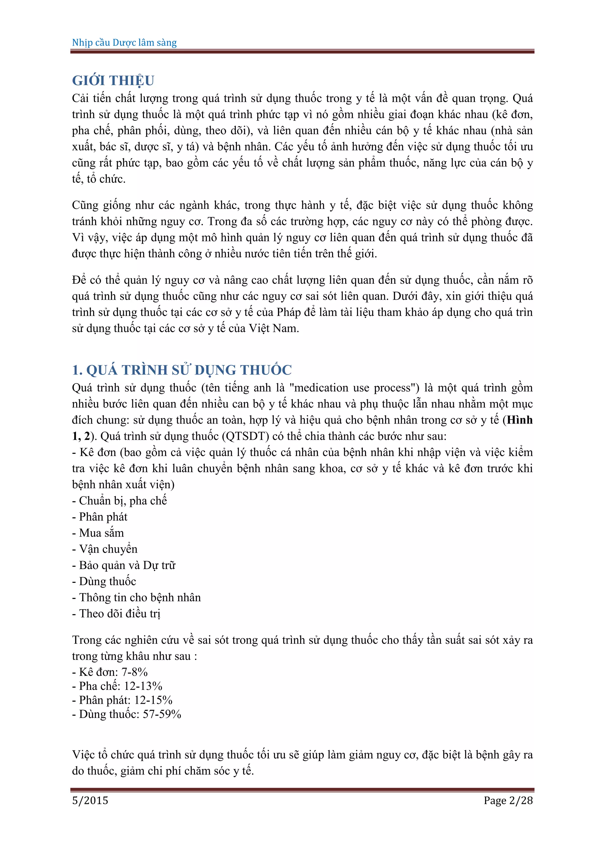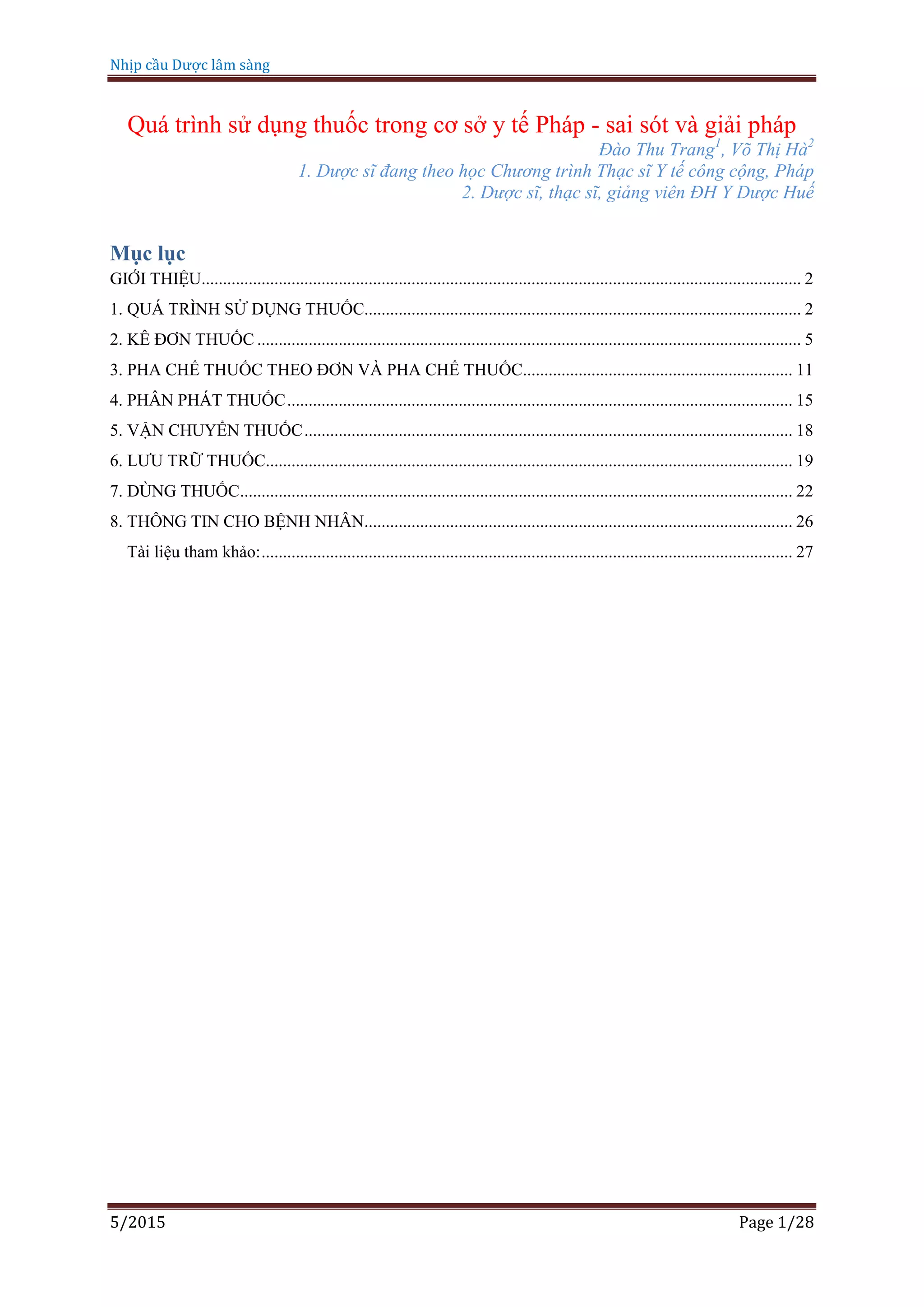 Tài liệu thảo luận về quá trình sử dụng thuốc trong y tế tại Pháp, nêu bật tầm quan trọng của cải tiến chất lượng và quản lý nguy cơ trong các giai đoạn kê đơn, pha chế, phân phát, và theo dõi thuốc. Tài liệu cũng chỉ ra tần suất sai sót xảy ra trong từng khâu và nhấn mạnh sự cần thiết phải tổ chức tối ưu để giảm nguy cơ và chi phí chăm sóc y tế. Cuối cùng, tài liệu cung cấp hướng dẫn chi tiết về quy trình kê đơn và các yếu tố gây ra sai sót trong việc sử dụng thuốc.