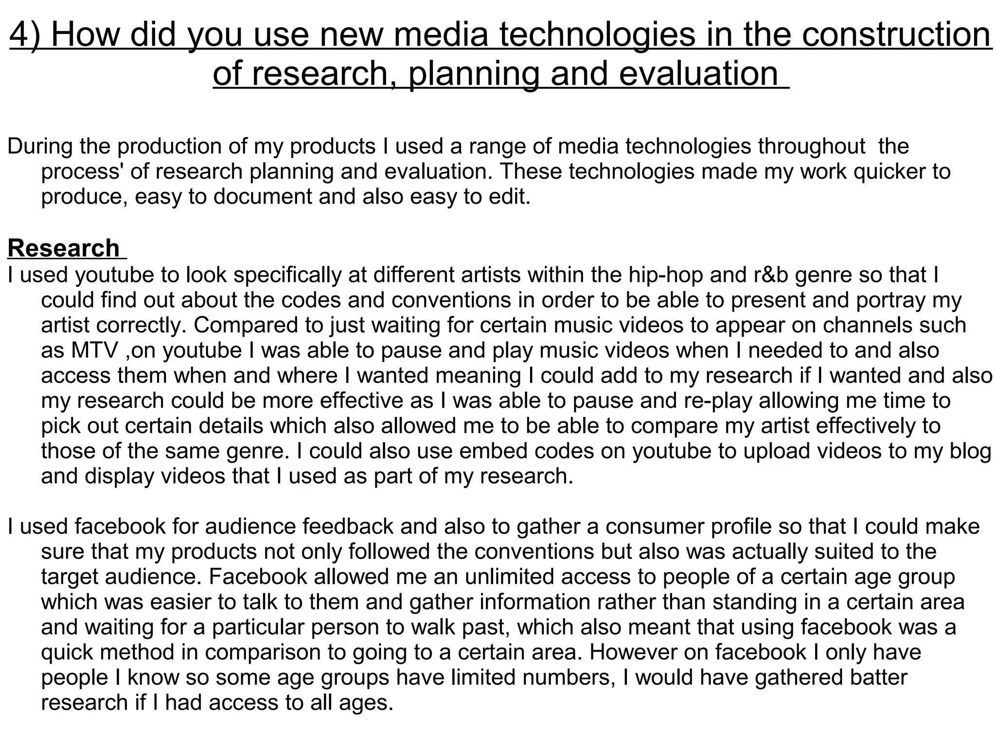 The student used new media technologies throughout the research, planning, construction, and evaluation of their media products. YouTube, Google, and Facebook were used for research to analyze music videos, gather audience feedback, and develop a consumer profile. Final Cut Pro and Photoshop were used to edit videos, create graphics, and design packaging. Evaluation utilized YouTube, Facebook, SoundCloud, and Mac camera to gather audience feedback and record presentations. While some technologies provided advantages, limitations included limited audience reach and engagement on Facebook.