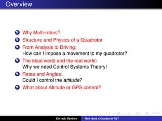 The document discusses how a quadrotor flies through physics, mathematics, control systems, and computer science. It explains that a quadrotor uses four propellers to generate thrust forces for lift and control. The speeds of the four propellers can be varied independently to control the quadrotor's roll, pitch, yaw rates and total thrust based on equations. However, real quadrotors face challenges due to differences in hardware. Control systems using feedback from sensors are needed to achieve reliable control despite uncertainties.