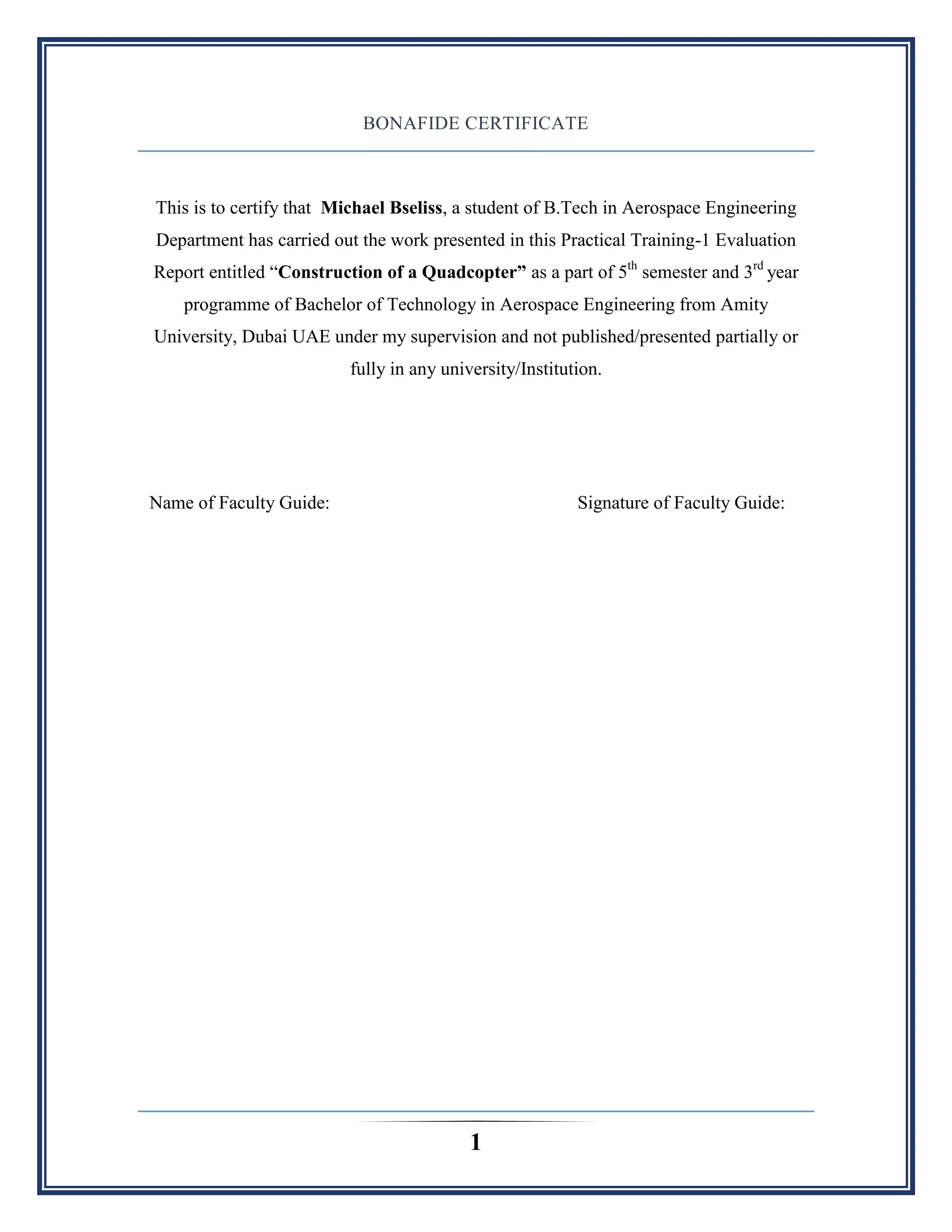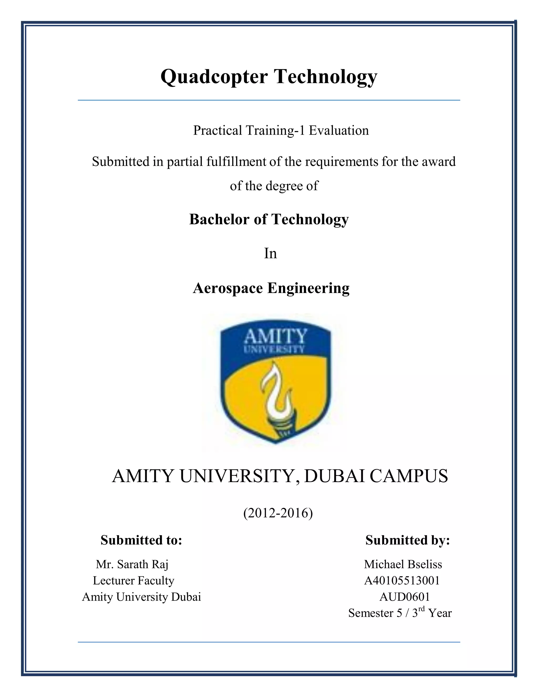 This document is a report submitted by Michael Bseliss in partial fulfillment of the requirements for a Bachelor of Technology degree in Aerospace Engineering from Amity University, Dubai. The report evaluates a practical training on the construction of a quadcopter. It includes sections on the introduction, literature review, components, flight control, applications and advantages/disadvantages of quadcopters. Key components discussed include the frame, propellers, motors, flight controller, batteries and other optional additions like cameras. Applications highlighted are in areas like agriculture, delivery services, and photography.