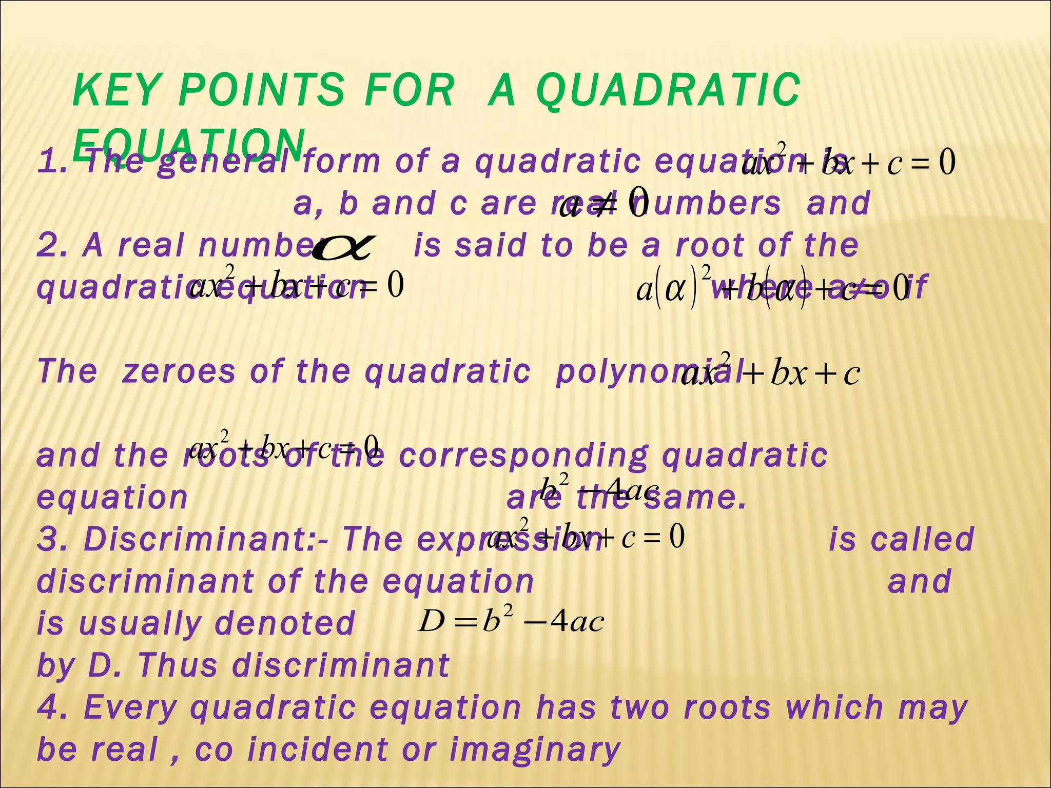 This document provides key points about quadratic equations: 1) The general form of a quadratic equation is ax2 + bx + c = 0, where a, b, and c are real numbers and a ≠ 0. 2) A number α is a root if it satisfies the equation when substituted for x. The roots are the same as the zeroes. 3) The discriminant, D = b2 - 4ac, determines the nature of the roots - positive D means two real roots, zero D means equal real roots, and negative D means no real roots.